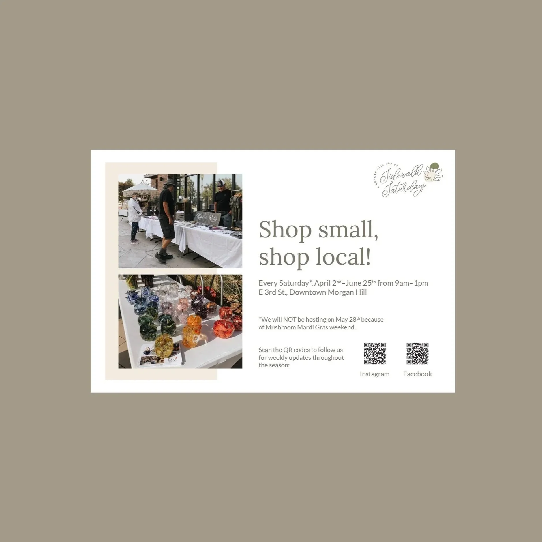 In my role as Event Marketing Designer for the city of Morgan Hill, I designed promotional materials leading up to the kick off and start of each Sidewalk Saturday season. The materials included A-frame signage, flyers, and posters. Sidewalk Saturdays was a series put on by the city of Morgan Hill that hosted a space for local businesses to sell their products and provided the community with an opportunity to shop small.